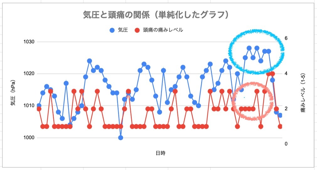 気圧と頭痛の関係グラフを振り返ってみると、気圧が大きく上昇した時点から首肩のコリが続きました。肉体的な負荷はいつも変わりありませんでした。まあ、その前週に夫婦喧嘩があったため、精神的な疲労があったかもしれませんが😅そこはちょっと置いといて、、