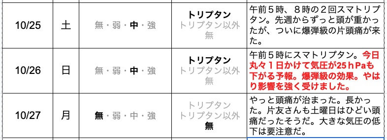 そんな記事もどこかで見かけたことがあるような。。。もしも気圧の変化による肩首のコリがあるとしたら、その時点で早めのスマトリプタンの服用はありなのかな?と思いました。