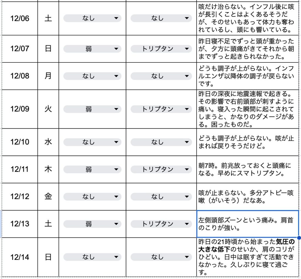 この2週間は体調が悪かったせいもあるのか、頭痛も合計5回発生しました。