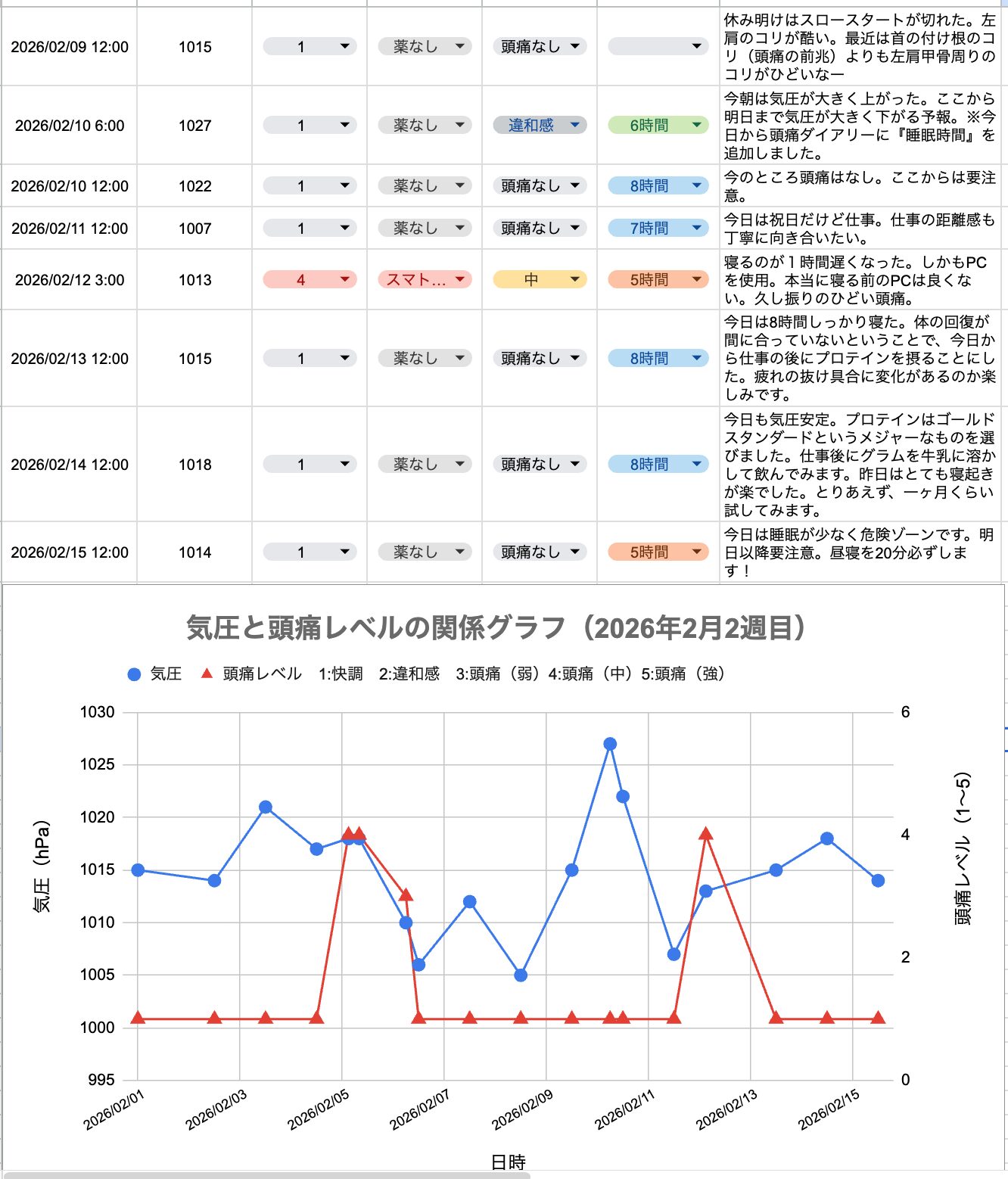今週は、気圧の低下と睡眠不足が重なった場面で1回頭痛がありました。寝る直前にPC仕事をしてしまったので、気圧の影響かPCの光のせいなのかはハッキリしません。