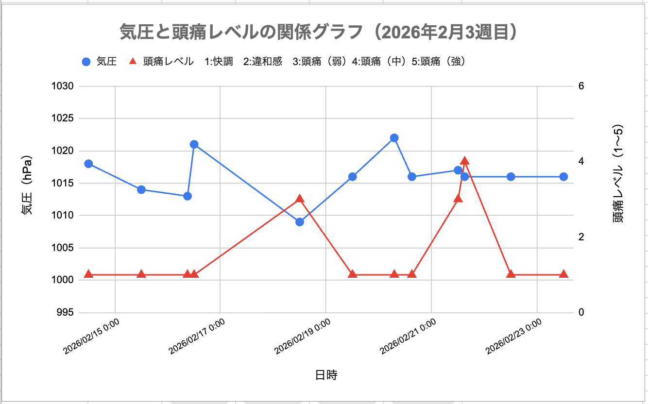 今週の「頭痛ダイアリー」&「気圧と頭痛レベルの関係グラフ」
