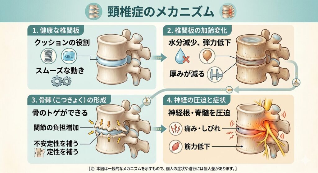 本記事に掲載している図解は、頸椎の構造と神経圧迫の一般的なメカニズムを説明するためのイメージ図です。実際の症状の原因や進行には個人差があり、必ずしもすべての方に当てはまるものではありません。